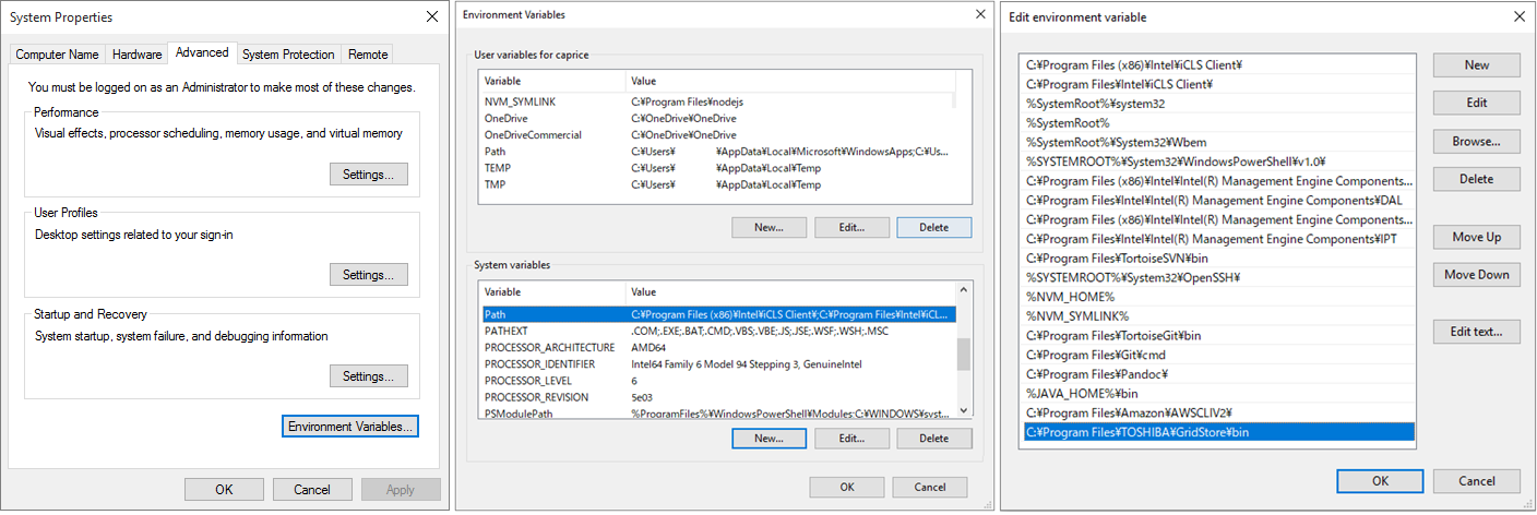 - Click the Windows button (Start), enter SystemPropertiesAdvanced.exe to open the Advanced System Settings, and then click "Environment Variables" to open the settings screen for environment variables. Select Path under system environment variables, click on Enter, and add the installation directory